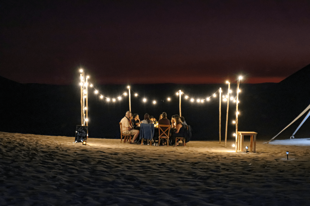 4.50 P.M. Desde nuestro punto de encuentro, cerca de Huacachina y tras una breve inducción de seguridad, los participantes abordarán los vehículos Can-Am para una emocionante travesía por las dunas. Al llegar a un punto especial entre las arenas, los esperará una escenografía preparada para una cena inolvidable. El menú de 5 tiempos incluye opciones variadas para satisfacer diferentes gustos: