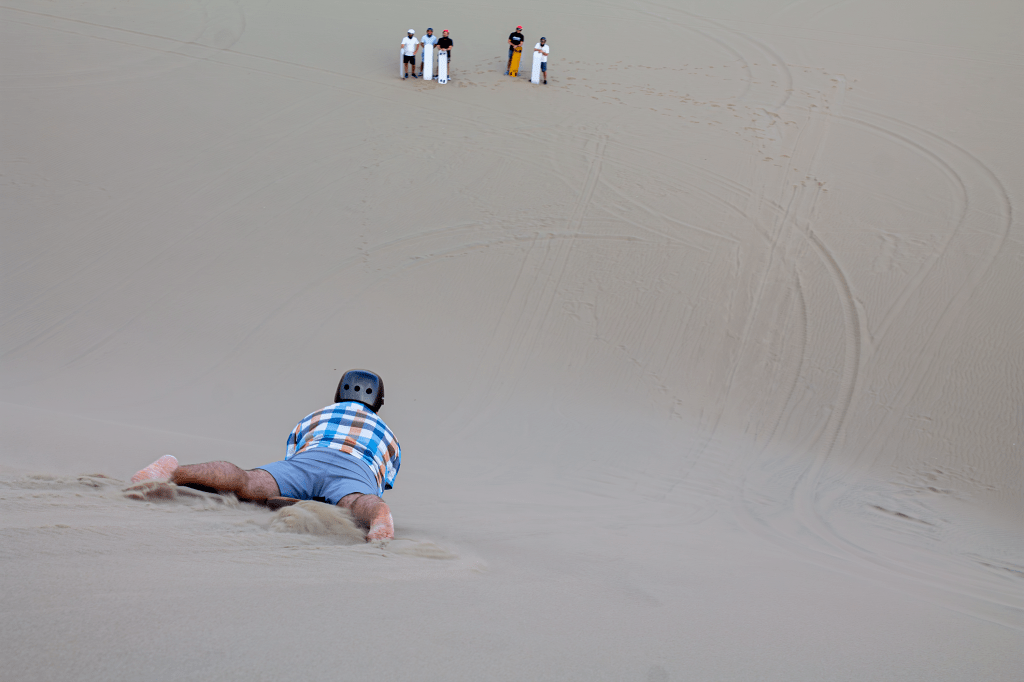 Punto de partida: Coordinación del punto de encuentro en Huacachina. Durante el recorrido, se realizarán dos paradas para que los pasajeros puedan practicar el deporte de sandboarding (actividad opcional); es en este momento, donde el conductor-instructor le entregará a cada pasajero su tabla semiprofesional y le enseñará la forma correcta de cómo deslizarse (recostado en la tabla, en posición boca abajo).