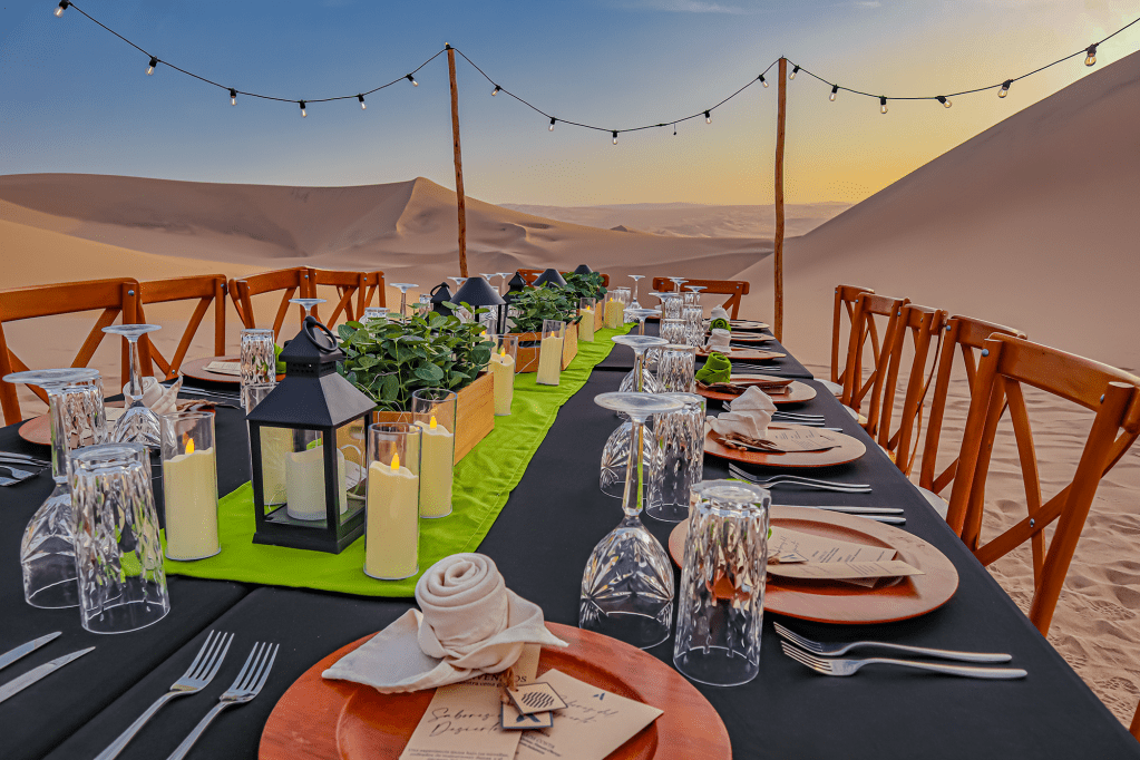 Luego de la cena, a las 8:35 PM, da inicio la fiesta bajo las estrellas, con música y un área de baile preparada especialmente para la ocasión. Los asistentes podrán relajarse y celebrar en el corazón del desierto, en un entorno único y lleno de encanto.